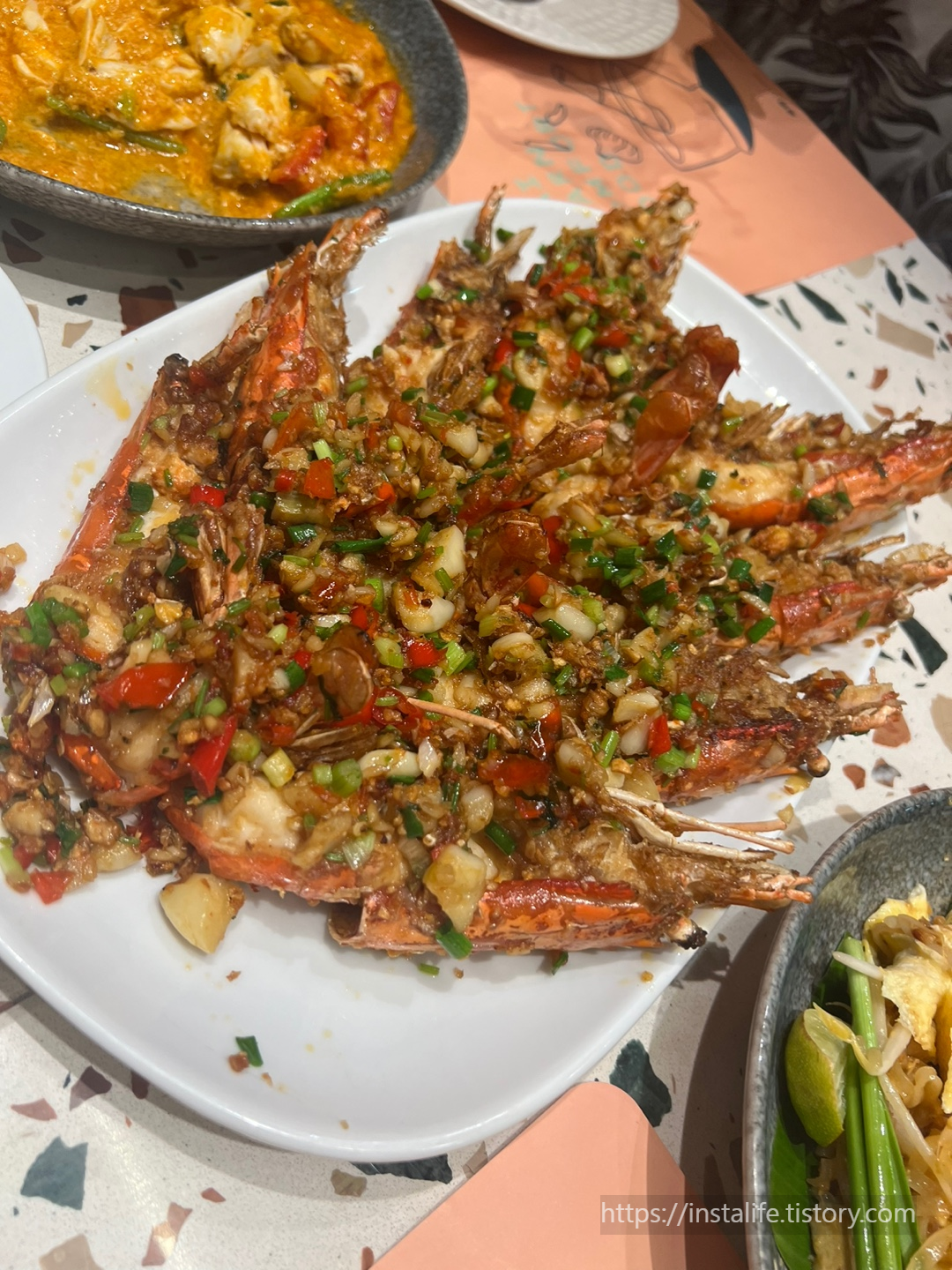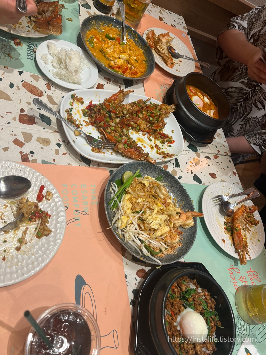 저희는 새우팟타이, 푸팟퐁 커리와 마늘향과 고수향이 나는 칠리 가재튀김, 그리고 일행들이 이름 모를 두 가지 메뉴를 주문했습니다.. 이렇게 블로그에 작성할 줄 알았으면 이름을 알아올걸 그랬습니다.