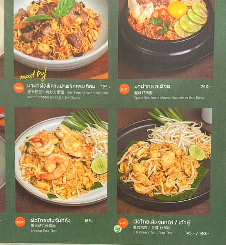 1. 메뉴: 다양한 태국 음식, 특히 매운 요리와 해산물 요리가 유명합니다. 대표 메뉴로는 똠얌꿍, 팟타이, 그리고 다양한 카레 요리 등이 있습니다.