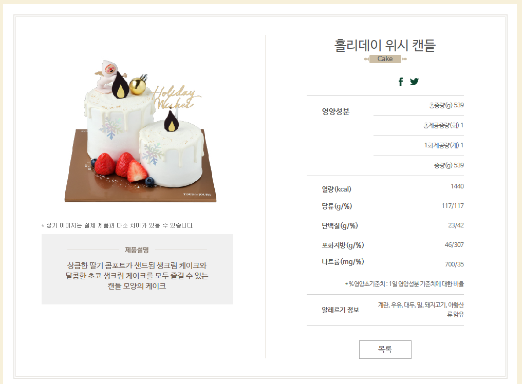 홀리데이 위시 캔들 칼로리 표/ 출처 - 뚜레쥬르 공식홈페이지