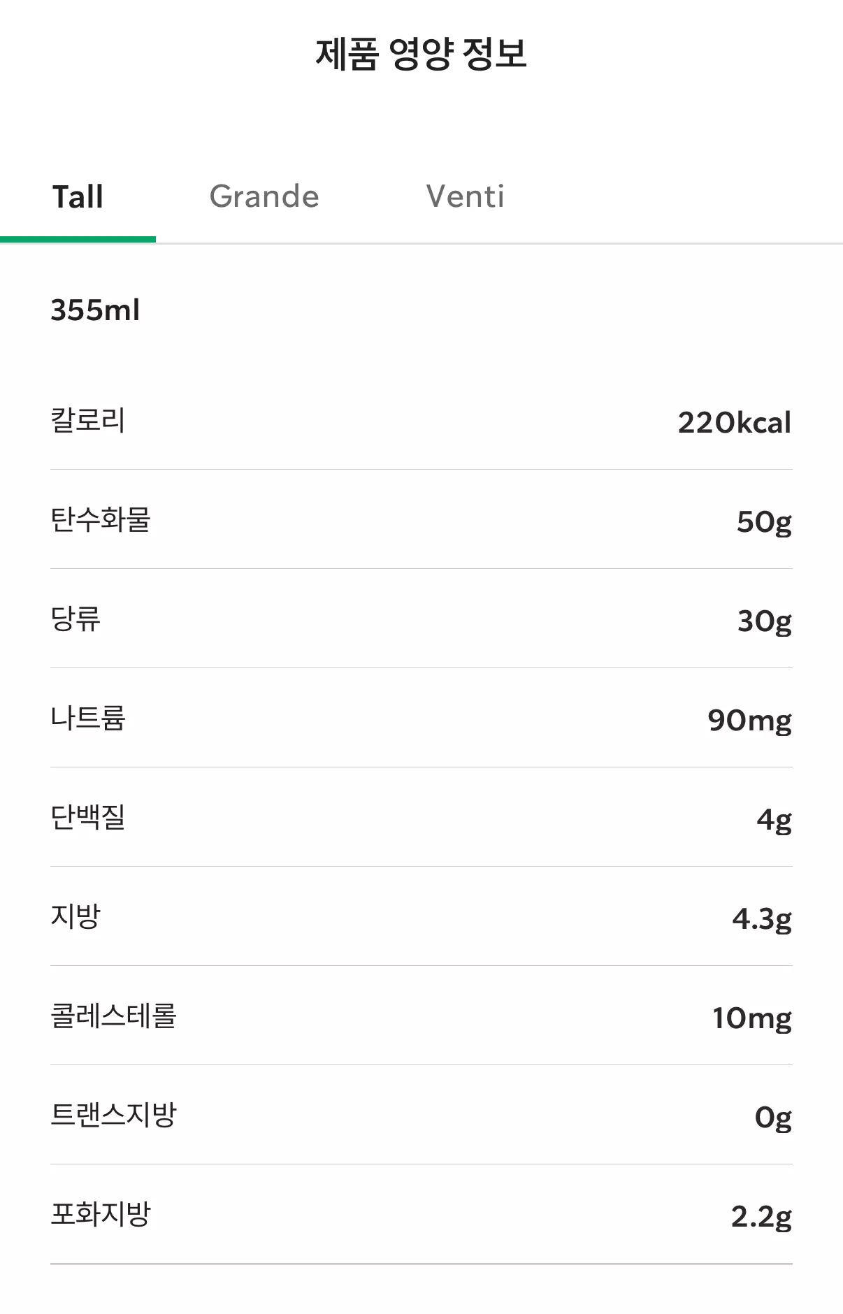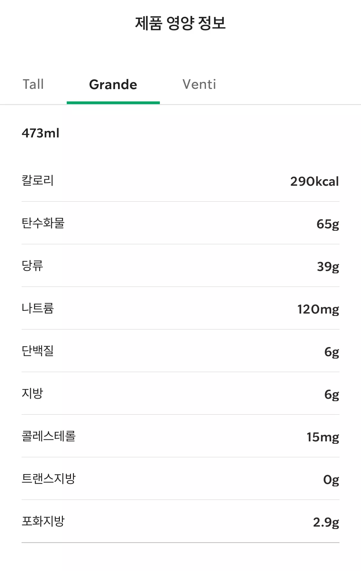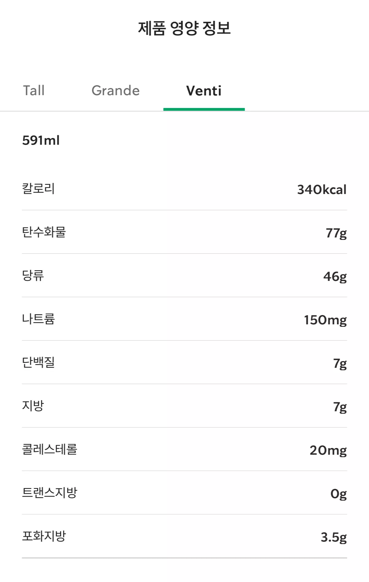 칼로리와 당류 모두 tall 사이즈 기준 나쁘지 않은 것 같습니다 ㅎㅎ~