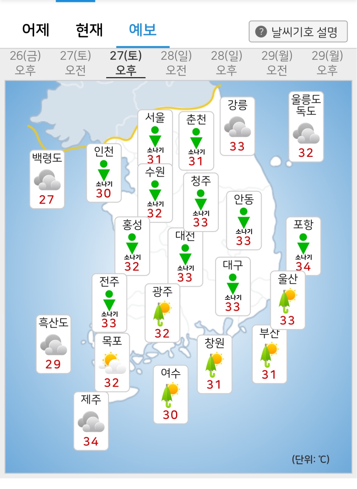 아침 최저기온은 24~27도, 낮 최고기온은 30~34도 수준입니다. 당분간 전국적으로 최고체감온도가 35도 내외의 매우 무더운 날씨가 이어질 것으로 예상됩니다.