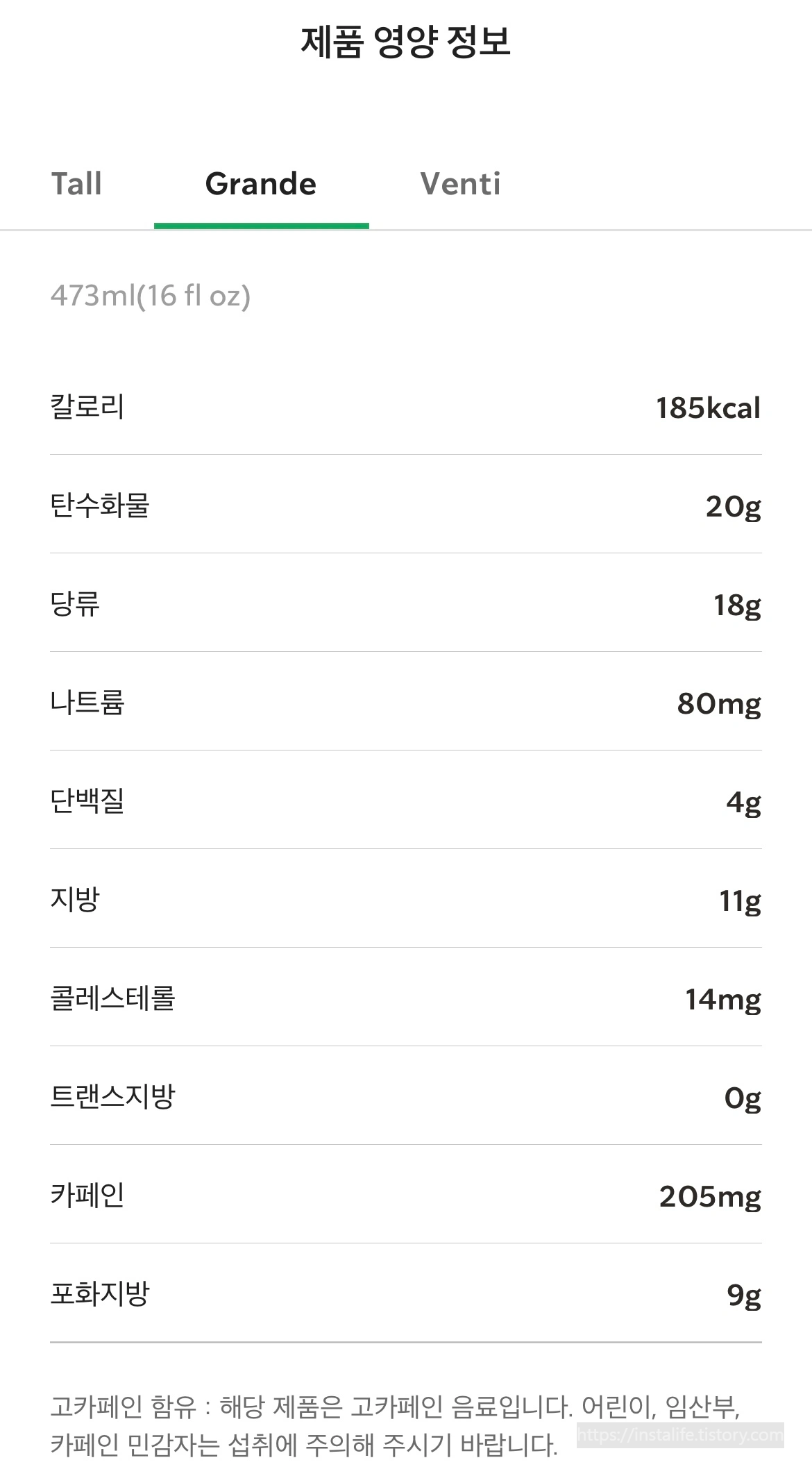 투썸플레이스 바닐라라떼 성분표/ 출처- 투썸플레이스 앱