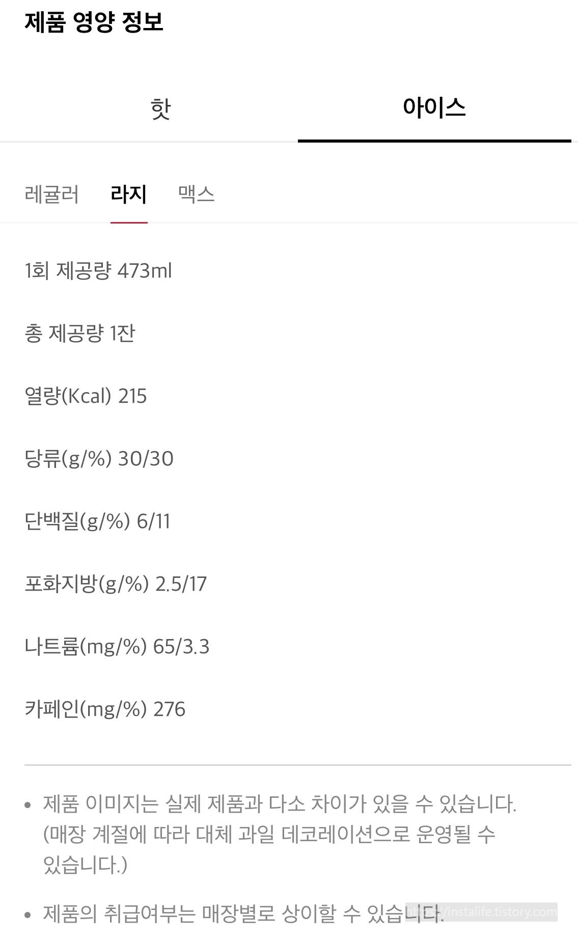 바닐라 크림 콜드브루 성분표/ 출처 - 스타벅스 앱